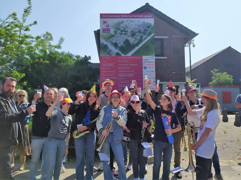 Onthullen bouwbord aan de Lyceumlaan: muziek, confetti, een drankje en een ijsje. Dus een geslaagd 3e en 4e lesuur.